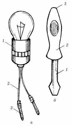 Рис. 3. Индикаторы напряжения: а – контрольная лампочка: 1 – резьбовый патрон с лампой накаливания; 2 – провод; 3 – щуп; б – индикаторная отвертка: 1 – жало; 2 – корпус отвертки с вмонтированной лампочкой; 3 – контактная головка отвертки.