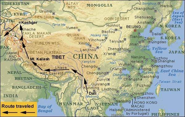 The route starts in southwestern China, in the rural town of Dali, just to west of Kunming, Yunnan. This area forms the eastern terminus of the great Himalayas, the start of the journey. From there it goes northwesterly into the eastern part of Tibet, locally known as Kham. The high forested mountains and valleys of Kham finally give way to the area of central Tibet and the capital city, Lhasa. Leaving Lhasa the road goes toward Mt. Everest and just before reaching the Nepal border a dirt track points the way to the holy Mt. Kailash of Western Tibet. From this most scared pilgrimage site, the main road goes northwesterly through Ali, then across one of the highest most desolate roads in the world, crossing the Askin Chin basin. After descending from this 16,500 foot basin, the Kunlan Shan Mountains are one of the last obstacles before reaching Kashgar in far western China. The Karakoram Highway connects this silk road town with Pakistan and is followed to the final ending point of Gilget, Pakistan. The entire route covers a distance of more than 3,300 miles (5,500 KM).