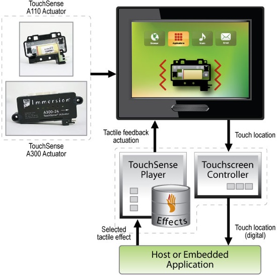 Подобный подход применяется уже довольно давно, причём практически монопольное положение на рынке занимает компания , продвигающая систему TouchSense. В зависимости от размера и назначения сенсорного экрана используются разные реализации этой технологии. В больших дисплеях (например, в информационных киосках и платёжных терминалах) устанавливаются виброприводы, а в планшетах и смартфонах — миниатюрные пьезоэлементы. На сайте Immersion доступны средства разработки программного обеспечения, предназначенного для тех или иных устройств, а также рассчитанные на различное ПО. Фирменная среда разработки MOTIV Development Platform позволяет автоматизировать создание «отзывчивых» приложений для электроники под управлением операционной системы Android.