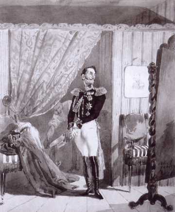 В 1852-1853 годах Зичи исполняет серию юмористических, не слишком изысканного вкуса, рисунков офицеров, занятых своим туалетом. Два из них он преподносит Николаю I (кат. 20, 21). Рисунки понравились императору, и он приглашает Зичи в Гатчину, поручив ему зарисовать события нескольких дней, проведенных при Дворе. Так родилась первая “Хроника трех дней в Гатчине”. Видимо, к тому же времени относится и акварельный групповой портрет царствующего семейства (ГРМ).