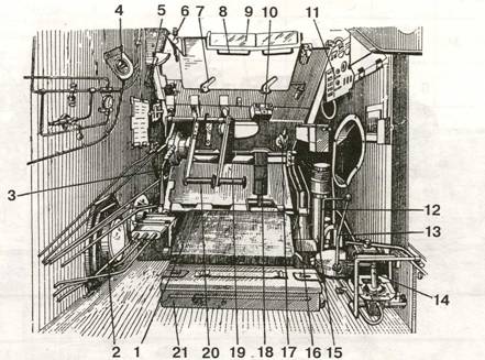 1 - сиденье механика-водителя, 2 - кронштейн амортизатора, 3 - рычаг управления левым ПМП, 4 - спидометр, 5 - рукоятка