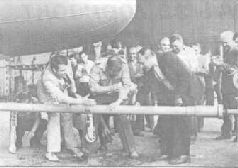 Традиционная бутылка шампанского разбита. Участники церемонии собирают «сувениры». На переднем плане: автор, нач. цеха окончательной сборки В.Р.Войцеховский, зам.директора КМЗ О.Г.Котляр. 23 июня 1985 г.