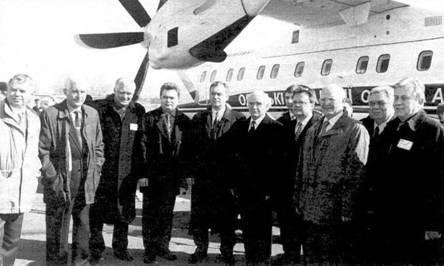 Первьш рейс Ан-140 завершен. У борта самолета слева направо: Генеральный директор АНТК им. О.КАнтонова В.Иг.Король, президент Ассоциации «У крае иа пром.» В.Н.Шмаров, зам. госсекретаря Министерства промышленной политики В.П.Казаков, президент корпорации «ИнтерАМИ» П.О.Науменко, и.о. Министра транспорта Украины О.П.Петренко, Генеральный конструктор П.В.Балабуев, председатель правления ОАО «Укр-транслизинг» А.Д.Юраков. ректор Национального авиационного университета В.П.Вабак, Генеральный директор ХГАПП АЖ.Мялица, директор авиакомпании «Одесские авиалинии» Ю.И.Скоропись, начальник управления авиапромышленности Минпромполитики В.П Жовтун