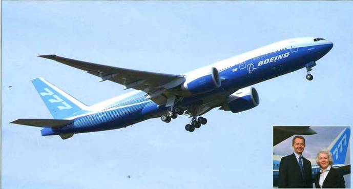 8 марта 2005 г. в Эверетте состоялся первый полет новой модификации двухдвигательного дальнемагистрального пассажирского самолета Boeing 777-200LR WorldUner. Его пилотировали командир экипажа Сюзанна Дарси-Эннеманн и ведущий летчик концерна «Боинг» по самолетам семейства 777 Фрэнк Сантони (на врезке). Новая машина имеет самую большую в мире дальность полета для коммерческих самолетов и способна перевезти 301 пассажира на расстояние до 17445 км. С октября 1990 г. «Боинг» продал более 680 самолетов семейства 777. На новую модификацию уже получено пять заказов от двух авиакомпаний.