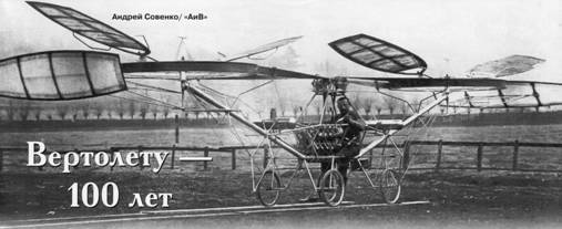 Четыре года назад человечество отметило вековой юбилей со дня полета самолета братьев Райт. Отметило с размахом, в тени которого чуть не померкла очередная дата: в текущем году исполняется 100 лет первому вертикальному взлету человека на вертолете. Способность вращающейся винтовой поверхности подниматься в воздух была известна еще в средние века. В частности, такие игрушки встречались в Китае. Итальянец Леонардо да Винчи пошел дальше: в 1475 г. он сделал первый эскиз летательного аппарата, способного «ввинчиваться» в воздух с помощью архимедова винта. Действующая модель вертолета соосной схемы – «аэро-дромическая машинка» – была создана россиянином М.В. Ломоносовым в 1754 г.