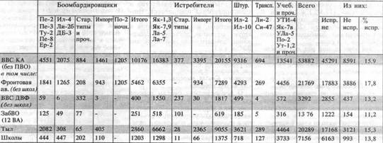 Накануне войны, на 22.06.1941 г. имелось летчиков – 30184 человека. Боевые потери летчиков за время войны – 27600 человек и не боевые – 3994, всего 31594 человека. Подготовлено летчиков за время войны – 44093 человека.