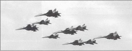 Вместе с тем в 2004 г. произошло событие историческое, возможно, не только для отечественной авиации. Впервые комплекс фигур высшего пилотажа выполняет четверка разнотипных самолетов: ромб из пары Су-27 и пары МиГ-29. Пилотажем в составе четверки удивить сложно, но ранее групповой пилотаж выполнялся только на однотипных машинах. Удержать плотный строй на разных самолетах много сложнее, поскольку те же Су-27 и МиГ- 29 имеют разные характеристики, к примеру по сваливанию.