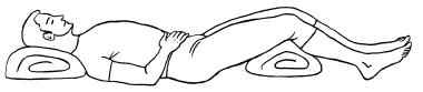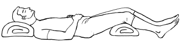 И.п. – лежа на спине, под головой небольшая подушка, валик под коленными суставами, одна рука на груди, другая на животе. Закрыть глаза и выполнять брюшное (диафрагмальное) дыхание в обычном ритме (вдох – брюшная стенка поднимается, выдох – втягивается), с постепенным углублением вдоха и удлинением выдоха. Вдох и выдох – через нос. Повторить 5–7 раз.