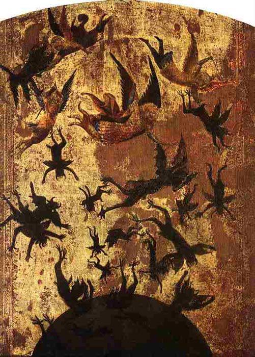 «Как упал ты с неба, денница, сын зари! Разбился о землю, попиравший народы. А говорил в сердце своем: „Взойду на небо, выше звезд Божиих вознесу престол мои… Взойду на высоты облачные, буду подобен Всевышнему“ (Исайя, гл.14, ст. 12, 13, 14);