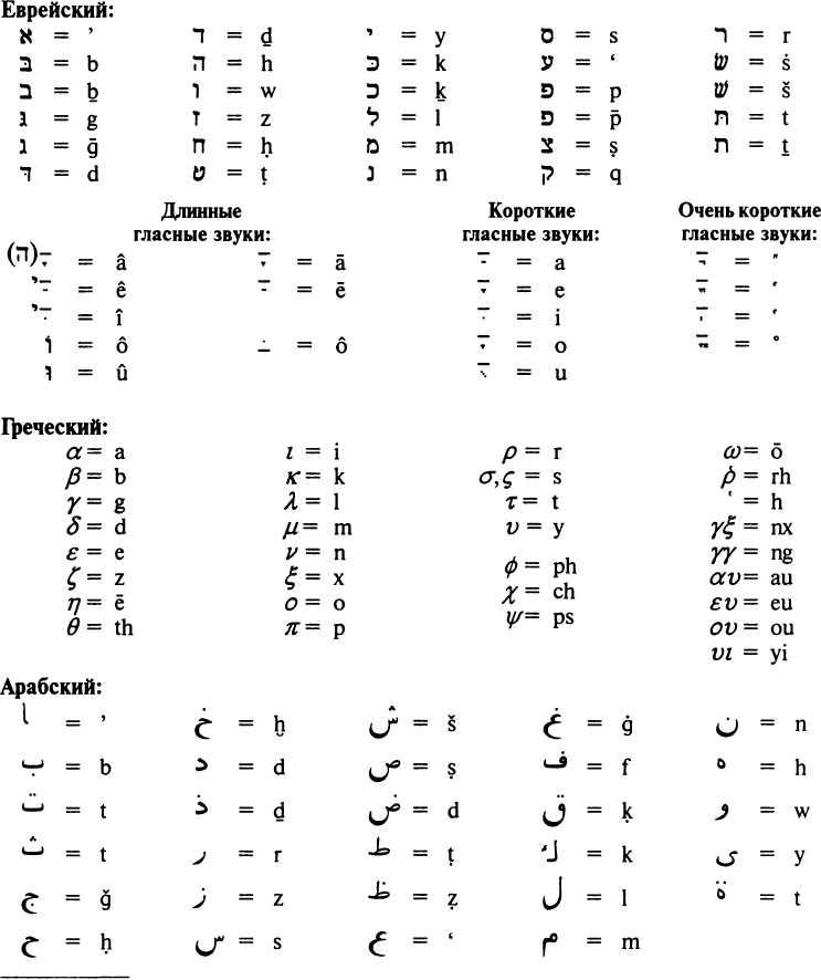 В этимологических справках используется латинский алфавит для слов с еврейской и греческой графикой письма. См. таблицу «Транслитерация» на с. 4.
