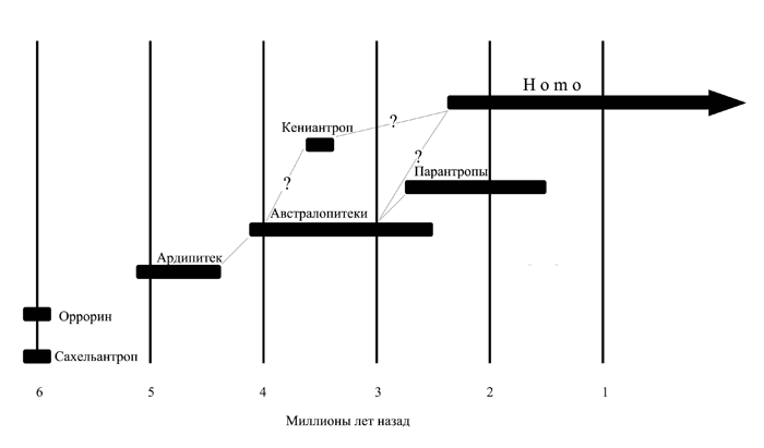 Рис. 1.3. Роды семейства гоминид на хронологической шкале. Показаны также их возможные генеалогические связи.