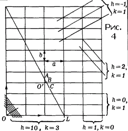 Каждая система плоскостей характеризуется индексами h и k. Их смысл иллюстрируется на примере семейства с индексами h=10 и k=3 (см. рис. 4). Чтобы не загромождать чертеж, мы построили шесть ближайших к узлу O плоскостей и провели еще одну, обозначенную L. Плоскость L является ближайшей к узлу O, отсекающей целое число периодов a и b по обеим осям решетки. Эти целые числа равны 3 по одной оси и 10 по другой. Проходя через ячейку O', плоскость L отсекает 1/10 долю периода a и 1/3 периода b. Смысл индексов h и k становится очевидным. Предоставляем вам самим составить фразу такого типа, как любят математики: «Индексами h и k называются…».