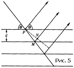 Рассмотрим одну из систем, характеризующихся межплоскостным расстоянием d (рис. 5). Каждая из плоскостей будет отражать падающий луч под одним и тем же углом θ (так называемый угол дифракции). Эти отраженные лучи когерентны, а потому долждны интерферировать между собой. Причем вторичные (отраженные) лучи будут усиливать друг друга в том случае, если после отражения от всех плоскостей семейства они будут распространяться в одной фазе. Иными словами, если разность хода между лучами равняется целому числу n длин волн. Разность хода |PM|+|MN| (см. рис. 5) между соседними отраженными лучами равна 2d sin θ (докажите!). Следовательно условие дифракции – условие усиления отраженных лучей – будет иметь вид