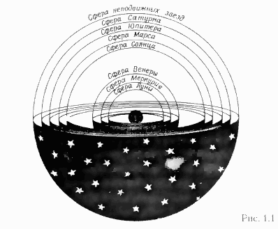 Аристотель думал, что Земля неподвижна, а Солнце, Луна, планеты и звезды обращаются вокруг нее по круговым орбитам. Он так полагал, ибо в соответствии со своими мистическими воззрениями Землю считал центром Вселенной, а круговое движение – самым совершенным. Птолемей во II веке развил идею Аристотеля в полную космологическую модель. Земля стоит в центре, окруженная восемью сферами, несущими на себе Луну, Солнце и пять известных тогда планет: Меркурий, Венеру, Марс, Юпитер и Сатурн (рис. 1.1). Сами планеты, считал Птолемей, движутся по меньшим кругам, скрепленным с соответствующими сферами. Это объясняло тот весьма сложный путь, который, как мы видим, совершают планеты. На самой последней сфере располагаются неподвижные звезды, которые, оставаясь в одном и том же положении друг относительно друга, движутся по небу все вместе как единое целое. Что лежит за последней сферой, не объяснялось, но во всяком случае это уже не было частью той Вселенной, которую наблюдает человечество.
