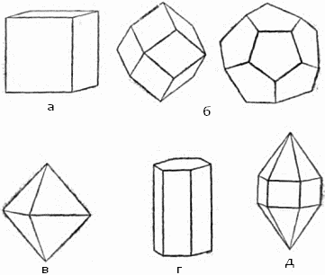 Рис. 3. Многогранники: а – куб; б – октаэдр; в – два додекаэдра – слева ромбододекаэдр, справа пентагондодекаэдр; г – шестигранная призма; д – сочетание призмы с двумя шестигранными пирамидами.