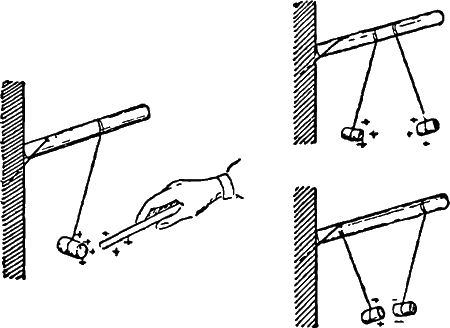 На вбитый в стену гвоздь наденем чистую сухую стеклянную трубочку, а к концу её подвесим на шёлковой нитке кусочек пробки (рис. 2, слева). Натрём стеклянную палочку мехом или плотной бумагой. Тогда на стекле появится положительное (стеклянное) электричество. Дотронемся затем этой палочкой до пробки. При этом часть электричества перейдёт с палочки на пробку. Теперь на пробке и на конце стеклянной палочки будет находиться электричество одного и того же рода (положительное), и пробка отскочит от палочки.