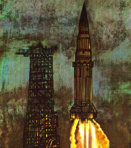 Кабину космонавта пронзила сначала вибрация, приходящая волнами откуда-то снизу; потом раздался приглушенный гром, который быстро превратился в протяжный непрерывный грохот. Из-под дна ракеты показалась длинная струя огненных молний, и ее огромный корпус, среди дыма и грохота, медленно отделился от земли, постепенно увеличивая скорость движения.