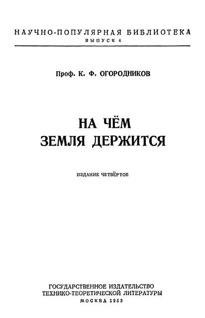 Вопрос о том, на чём держится Земля, человек задавал себе с самых древнейших времён. Этот вопрос возникает совершенно естественно, так как в нашей жизни мы всюду привыкли видеть, что каждый предмет должен обязательно иметь какую-нибудь поддержку, иначе он упадёт вниз, на землю. Корабль, плывущий в море, поддерживается снизу водой. Птица и самолёт также не лишены опоры: их поддерживает снизу воздух, на который они опираются своими крыльями.