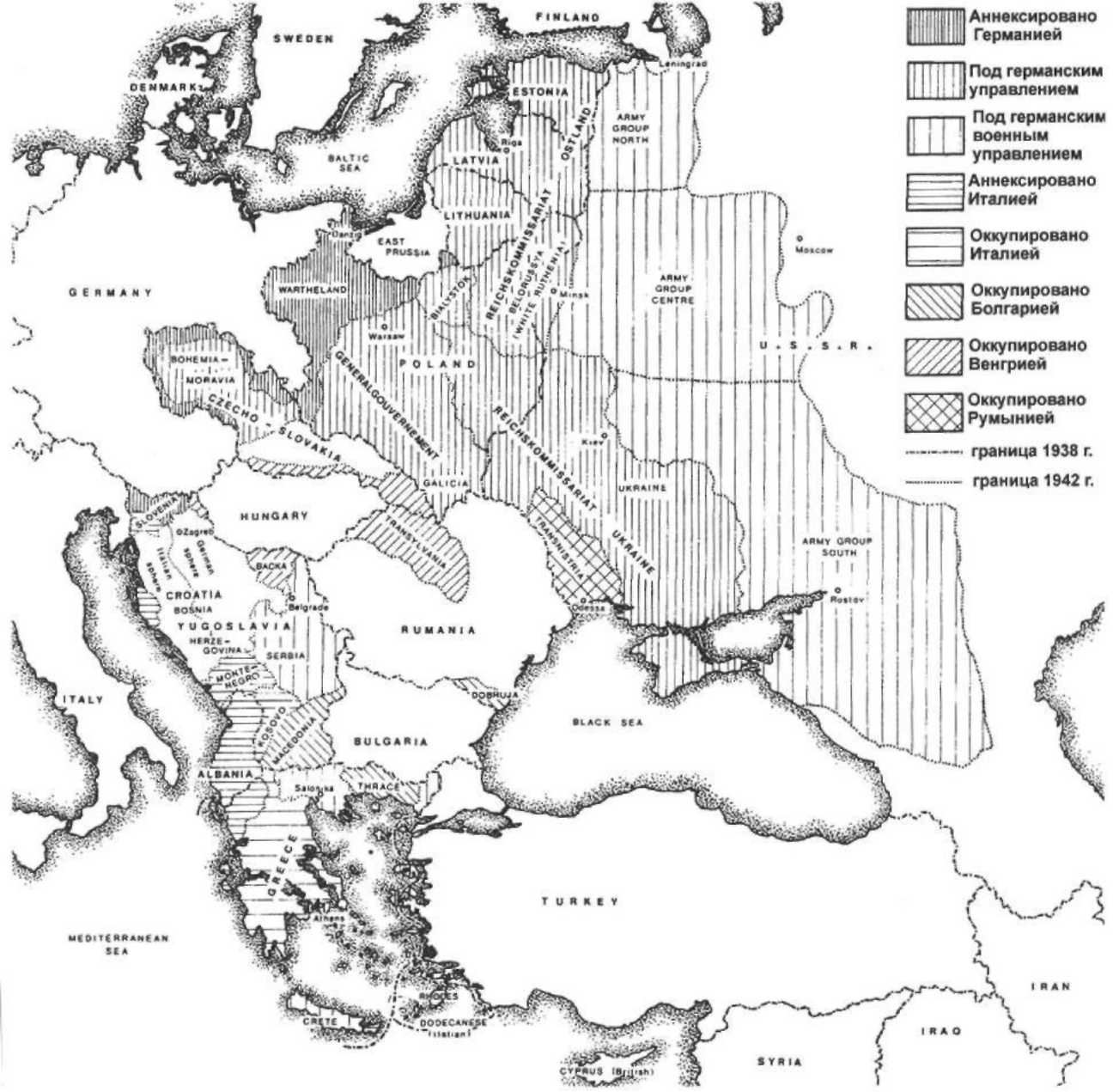 Немецкая полиция действовала на оккупированных территориях, руководствуясь причудливой смесью фашистских догматов и здравого смысла. Славянский Восток находился под оккупацией. «Исконно немецкие» территории были включены в состав Рейха, а на остальных пространствах были созданы протектораты (генерал-губернаторство в Польше, рейхскомиссариат Остланд и рейхскомиссариат Украина). Армейское управление осуществлялось на территориях, непосредственно прилегающих к линии фронта. Подобная организация создавалась в качестве временной меры, но просуществовала до конца войны. Гражданская администрация уступала место армейской по мере отступления немецкой армии на запад. Территория Молдавии контролировалась румынским правительством. Кроме того, румынские, словацкие и венгерские войска осуществляли контроль над территориями, номинально входившими в немецкую зону.