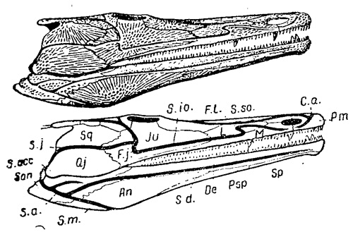 Рис. 2. Ископаемая амфибия (стегоцефал) Benthosuchus Sushkini, Ер. (бентозух) из эотриасовых песчаников р. Шаршенги Никольского района (верховья р. Юг, Вологодской обл.). Череп сбоку (1/4 натур. велич.).
