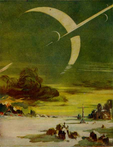 Вдруг со стороны Солнца в небе показалось какое-то огромное тело. Его металлическая обшивка нестерпимо сверкает в лучах Солнца. Оно несется вперед, похожее на самолет своими короткими, прижатыми к бокам крылышками, но летит почему-то вперед хвостом. Из сопла реактивного двигателя, которым оборудован этот корабль, вырывается ослепительная струя. И грохот, может быть, впервые раздавшийся в этом мире, разрывает вековечную тишину. Словно непрерывной орудийной кананадой салютует корабль своему прибытию на безмолвную планету.