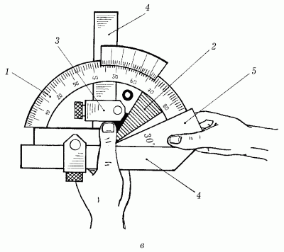 Рис. 1 (продолжение). Измерительные инструменты: в – угломер: 1 – полудиск со шкалой; 2 – подвижный сектор с нониусом, 3 – стопорный винт; 4 – линейка; 5 – измеряемая деталь.