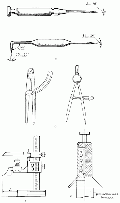 Рис. 2. Разметочные инструменты: а – чертилки; б – циркули; в – штангенрейсмус; г – кернер-центроискатель.