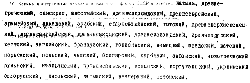 Нашу подборку открывает А.В.Зализняк, знающий свыше 40 языков. Он выпускник филологического факультета МГУ, сейчас сотрудник Института славяноведения, составитель русско-французского словаря. Он преподает санскрит, классический арабский и занимается вопросами русской морфологии. Кстати, А. Зализняку всего 28 лет. Профессор Пауль Аристэ, доктор филологических наук, член Академии наук Эстонской ССР, заведует единственной в СССР кафедрой финно-угорских языков в Тартуском университете. Л.И.Василевский не лингвист, он занимается вопросами экономической географии и работает в секторе экономики зарубежного транспорта Института комплексных транспортных проблем.