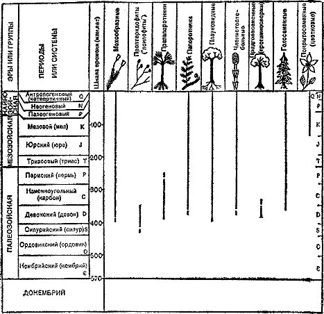 Рис. 1. Геохронологическая шкала эр (групп) и периодов (систем); линиями показано время существования основных групп высших растений