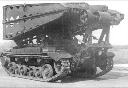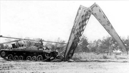 Танк-мостоукладчик «Валентайн». Вверху в походном положении, вишу в момент укладки пролета.