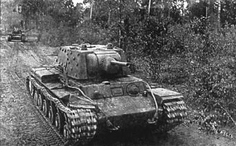 Танк КВ-1 первых выпусков движется навстречу противнику. Сводный полк 1-й танковой дивизии 1-го механизированного корпуса. Северо-Западный фронт, июль 1941 года.