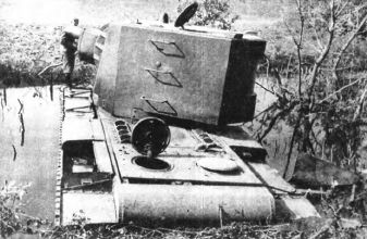 Застрявший в болоте и подорванный экипажем КВ-2 с башней МТ-1. 2-я танковая дивизия, Прибалтика, июль 1941 года.