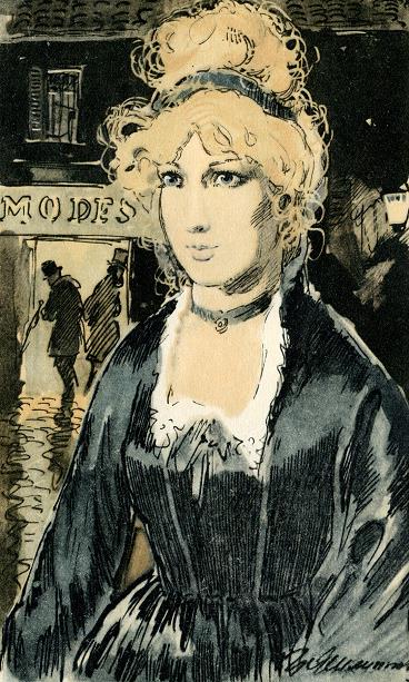 То был магазин новинок на углу улиц Мишодьер и Нев-Сент-Огюстен. В этот мягкий и тусклый октябрьский день его витрины сверкали яркими тонами. На башне церкви св. Роха пробило восемь; Париж только еще пробуждался, и на улицах встречались лишь служащие, спешившие в свои конторы, да хозяйки, вышедшие за провизией. У входа в магазин двое приказчиков, взобравшись на стремянку, развешивали шерстяную материю, а в витрине со стороны улицы Нев-Сент-Огюстен другой приказчик, стоя на коленях, спиной к улице, тщательно драпировал складками отрез голубого шелка. Покупателей еще не было, да и служащие только еще начали прибывать, но магазин уже гудел внутри, как потревоженный улей.