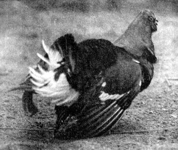 Очень рано в сером сумраке зарождающегося весеннего утра на открытую лесную поляну, служащую местом тока, прилетает косач-токовик. Некоторое время он спокойно и тихо сидит на земле. Иногда приходится слышать какой-то своеобразный хрипящий покрик, слегка напоминающий несколько сдавленный голос домашнего петуха: это токовик, пока еще тихо, дает знать о своем прибытии. Но вот тишину утра прорезывает полный бодрого призыва и кипучего азарта шипящий крик токовика, его протяжное «чуф-фыы!». Токовик, как говорят охотники, начал «чу-фыскать». На этот призыв откликаются ночевавшие в ближайших кустах косачи и с шумом слетаются на общий ток. Иногда, впрочем, старый токовик, ночевавший где-либо в мелколесье, около тока, пробирается на излюбленную полянку по земле.