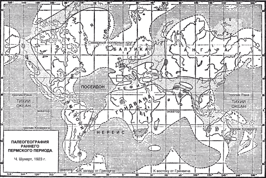Рис. 1. Карта мира в пермский период, составлена американским геологом Шухертом. Районы, отмеченные точками, соответствуют внутренним морям