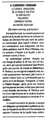 – Ша. Клермон-Ферран. Временный административный совет факультета литературы и гуманитарных наук в Клермон-Ферране опубликовал сообщение, где заявляет, что, кавычки, с возмущением узнал о жестокостях полиции, жертвой которой стал в Париже господин Пьер Пешу, адъюнкт-профессор истории данного факультета, кавычки закрываются. В сообщении сказано, что, кавычки, 28 мая около 22 часов господин Пешу был застигнут полицейской облавой, когда проходил по бульвару Сен-Мишель после проведенного в библиотеке трудового дня.